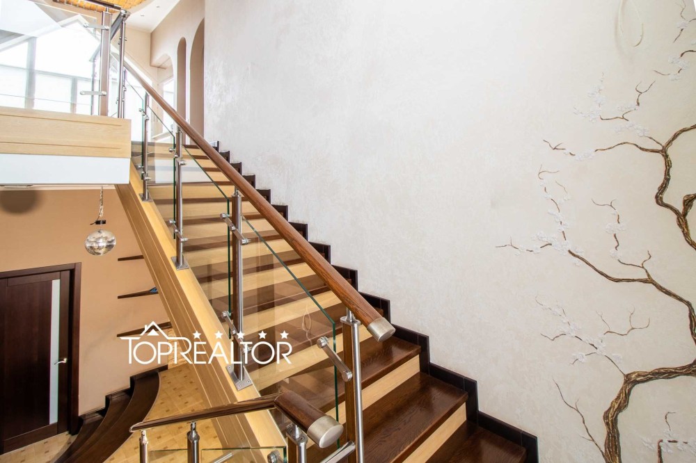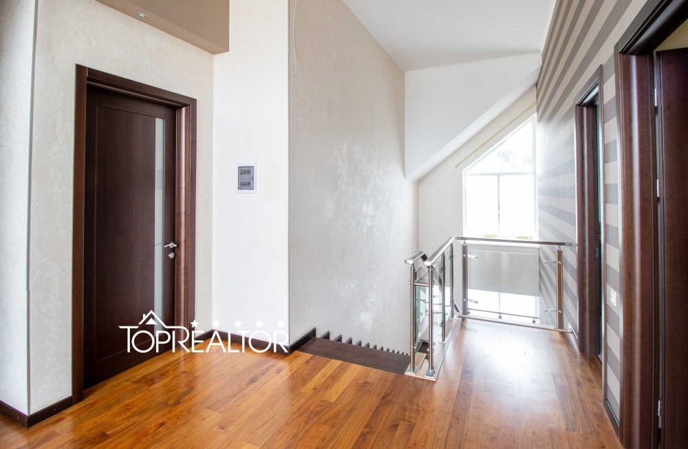 Общая площадь дома составляет 360 кв.м на трех этажах, с гаражом, шестью комнатами и тремя санузлами. Металлопластиковые окна и дубовые двери создают атмосферу уюта и комфорта. В гостиной установлен натуральный камин, на полу качественная паркетная доска, а из спален на втором этаже открывается потрясающий панорамный вид на водохранилище.