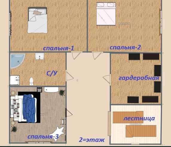 На втором этаже - три спальни, санузел и гардеробная.
