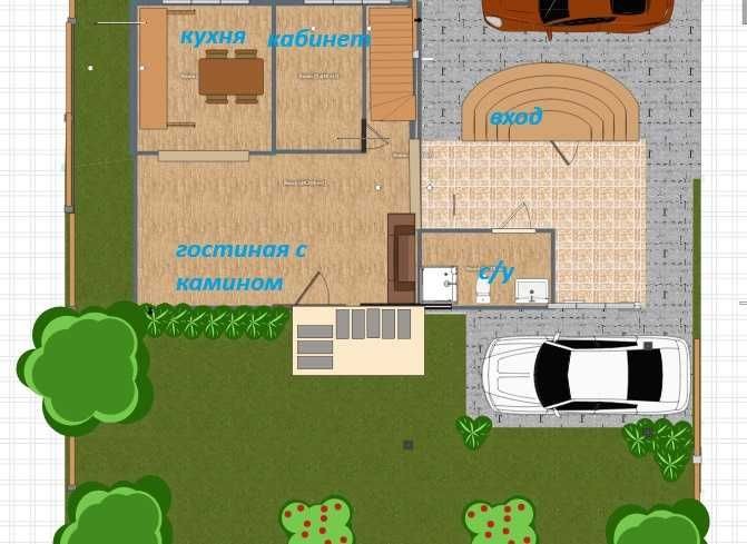 просторное открытое пространство на первом этаже с камином, кухней, столовой, отдельной спальней или кабинетом , санузлом и прихожей.