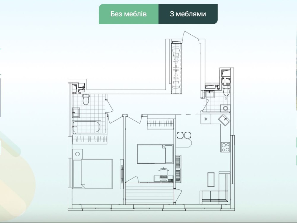 Два санвузли: Зручно зранку! Нема черги. У великому санвузлі можна встановити ванну, душову кабіну або джакузі — за бажанням.