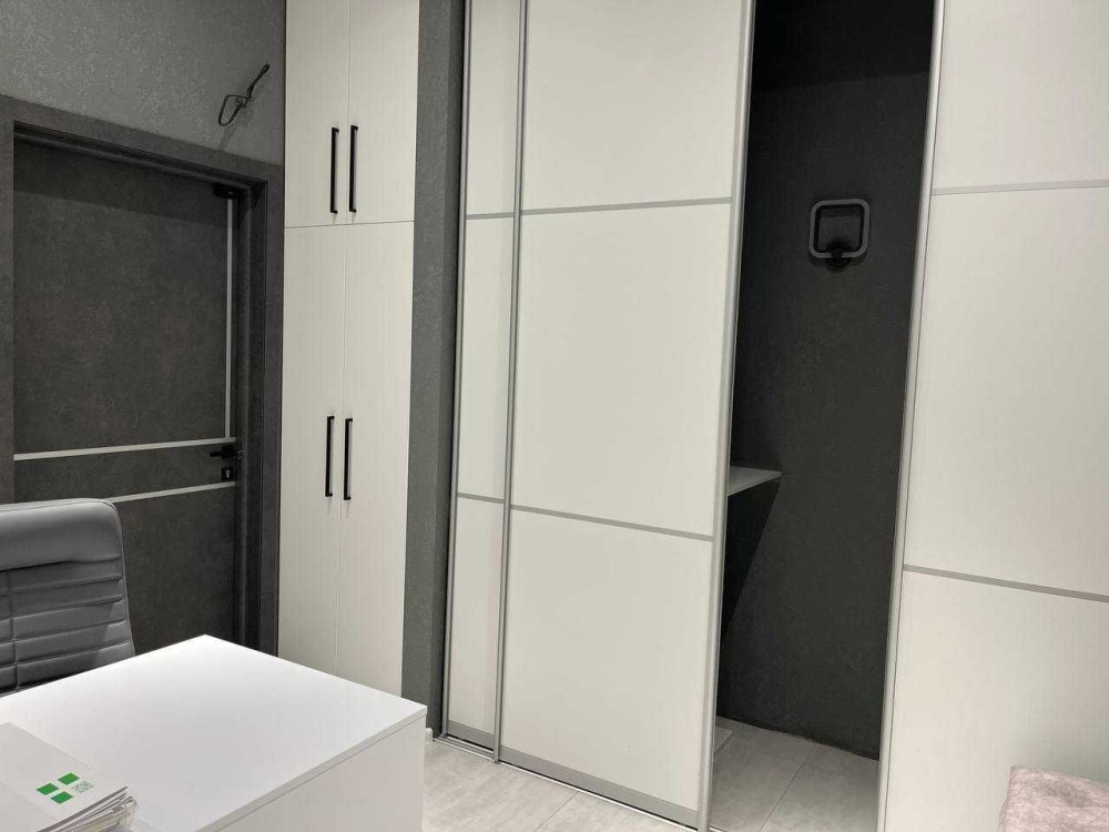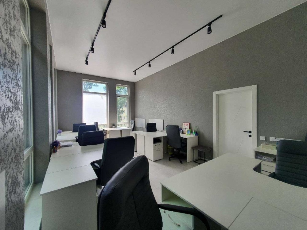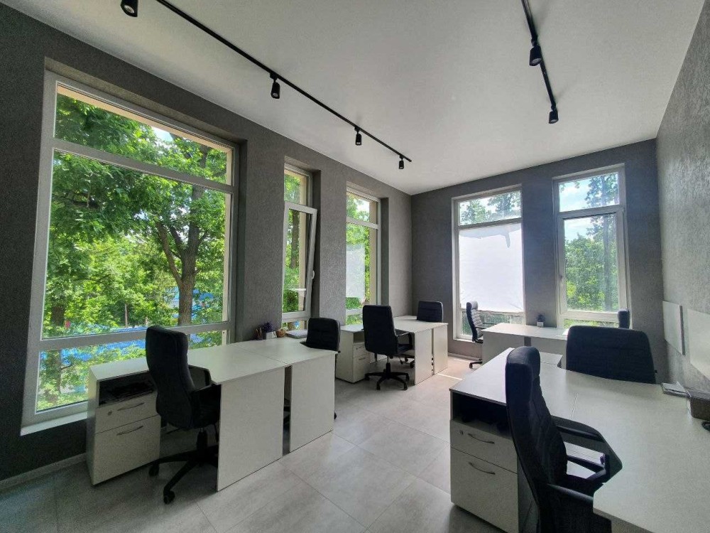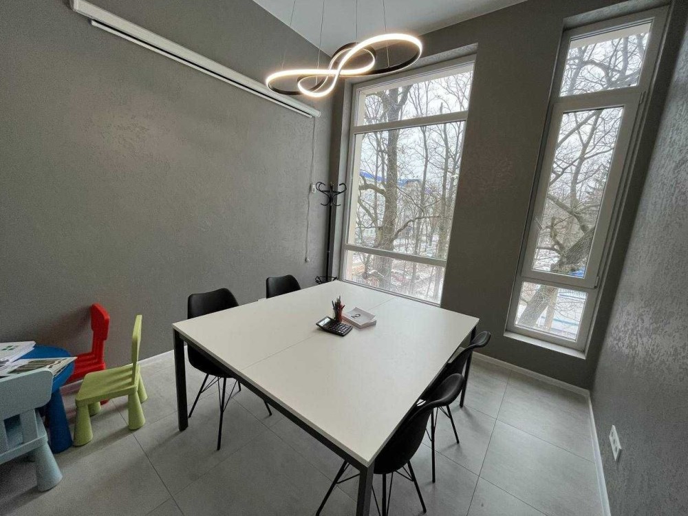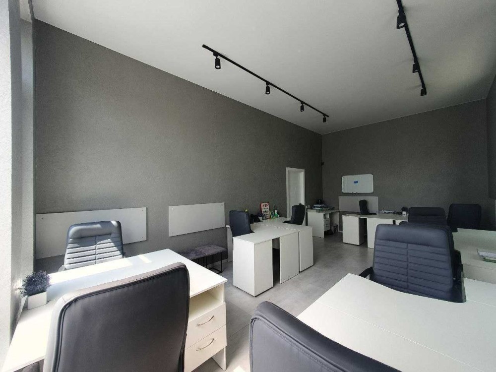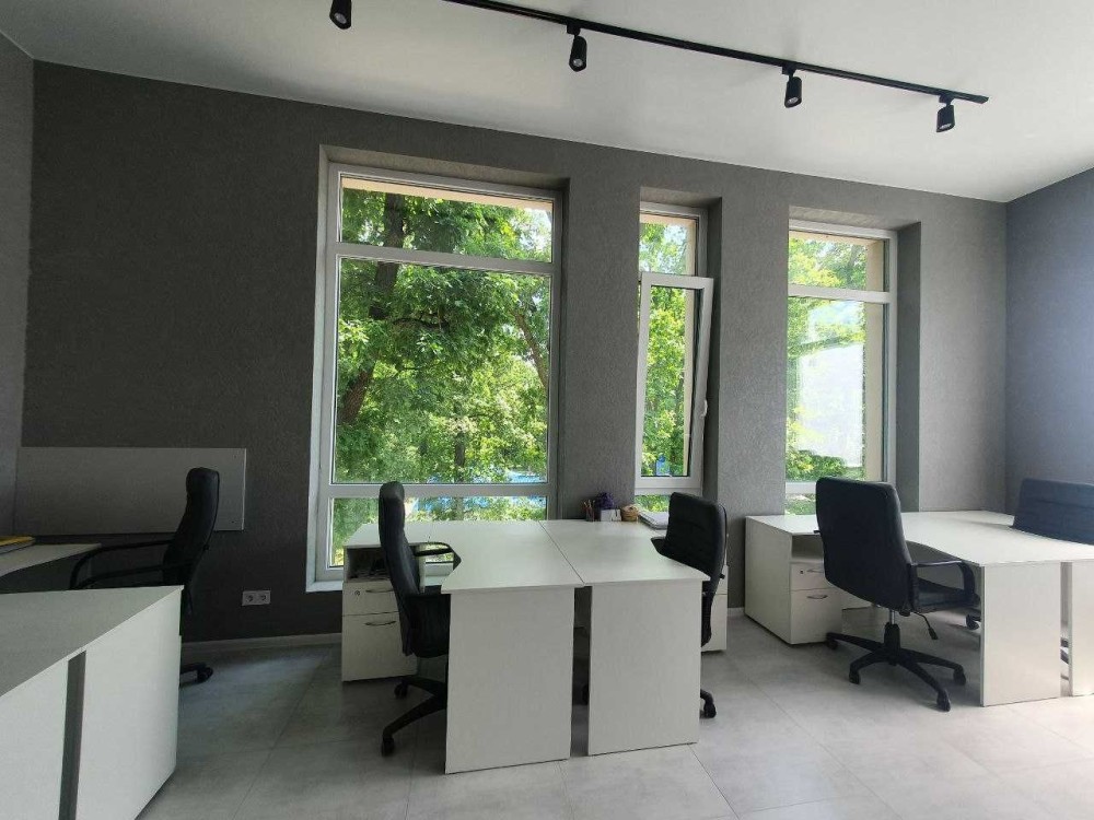 Загальна площа 76м2. Приміщення складається з просторого холу та 3-х окремих кабінетів: кімната для робочого простору на 10 місць, окремого кабінету керівника, переговорний, просторий хол з рецепшеном, і невелика вбудована кухня, яка окремо відділена розсувними дверима.