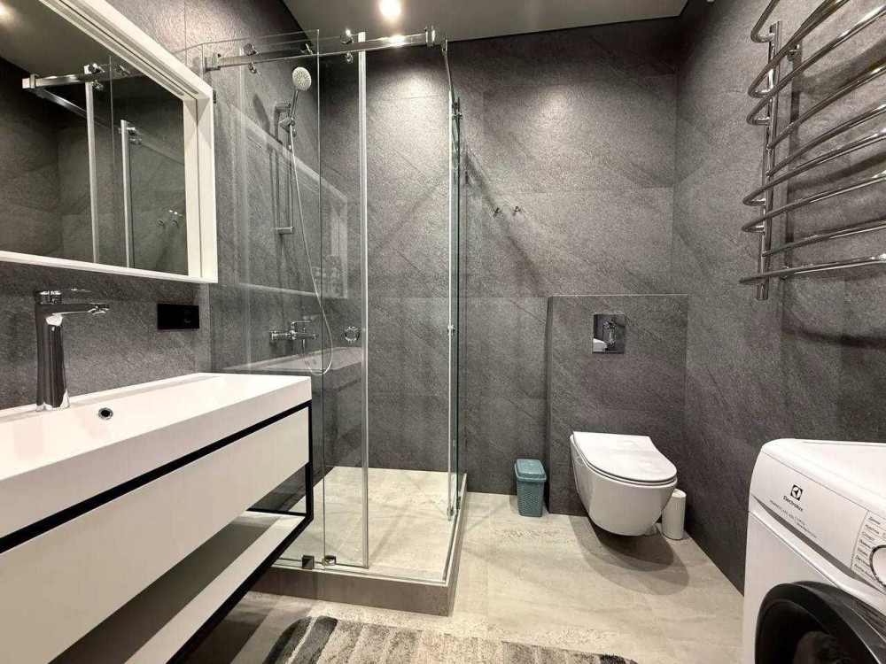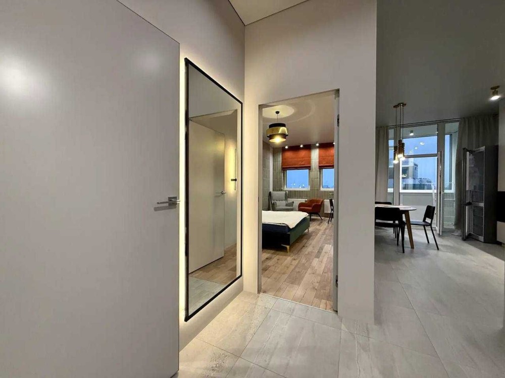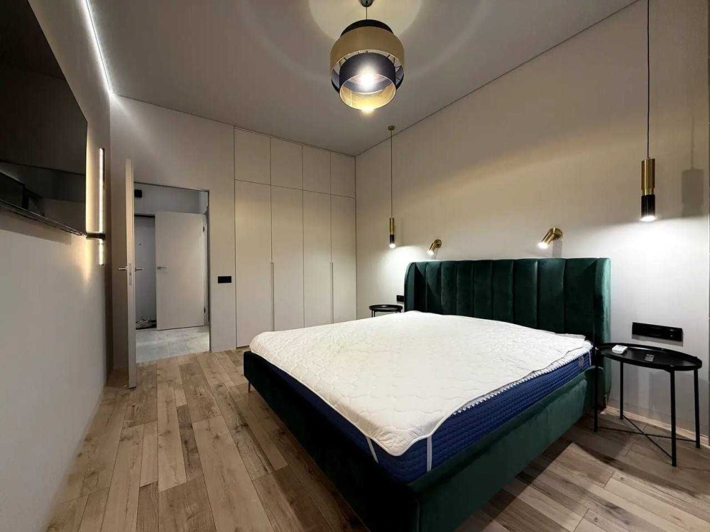 Планування: спальня з шафами, зоною відпочинку, кондиціонером та телевізором; окрема гардеробна кімната; вбудована кухня: холодильник, посудомийна машина, духова шафа, варильна поверхня; засклений балкон; суміжна ванна кімната: душова кабіна, туалет, бойлер на 80 л, пральна машина, електрична сушарка для білизни. Оптоволоконний інтернет. Тепла підлога. Зроблена шумоізоляція стін.