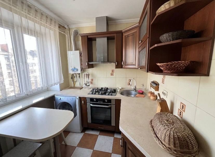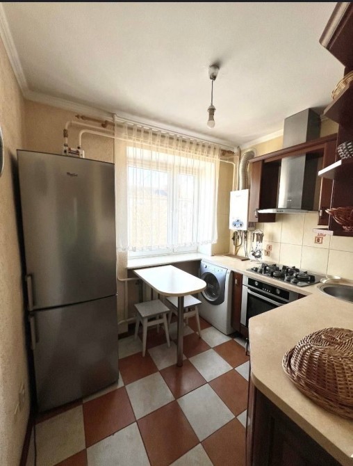 Кухня компактна з духовою шафою, холодильником, пральною машиною, меблями для зберігання, необхідним посудом та обіднім столом зі стільцями. Встановлена газова колонка. Опалення — централізоване. Додатковими перевагами є лоджія та кладовка. Квартира має зручне розташування з хорошою дорожньою розв’язкою, поруч магазини, зупинки громадського транспорту та вся потрібна інфраструктура.