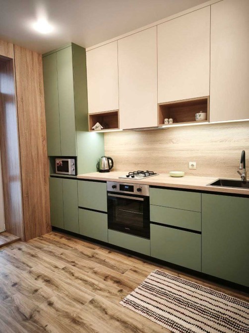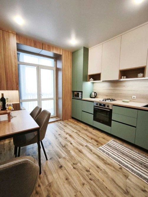 ​ Кухня з виходом на балкон: Повністю обладнана (холодильник, варильна поверхня, електродухова шафа,мікрохвильова піч, посуд та столові прилади), обідня зона.
