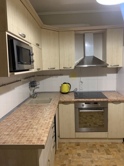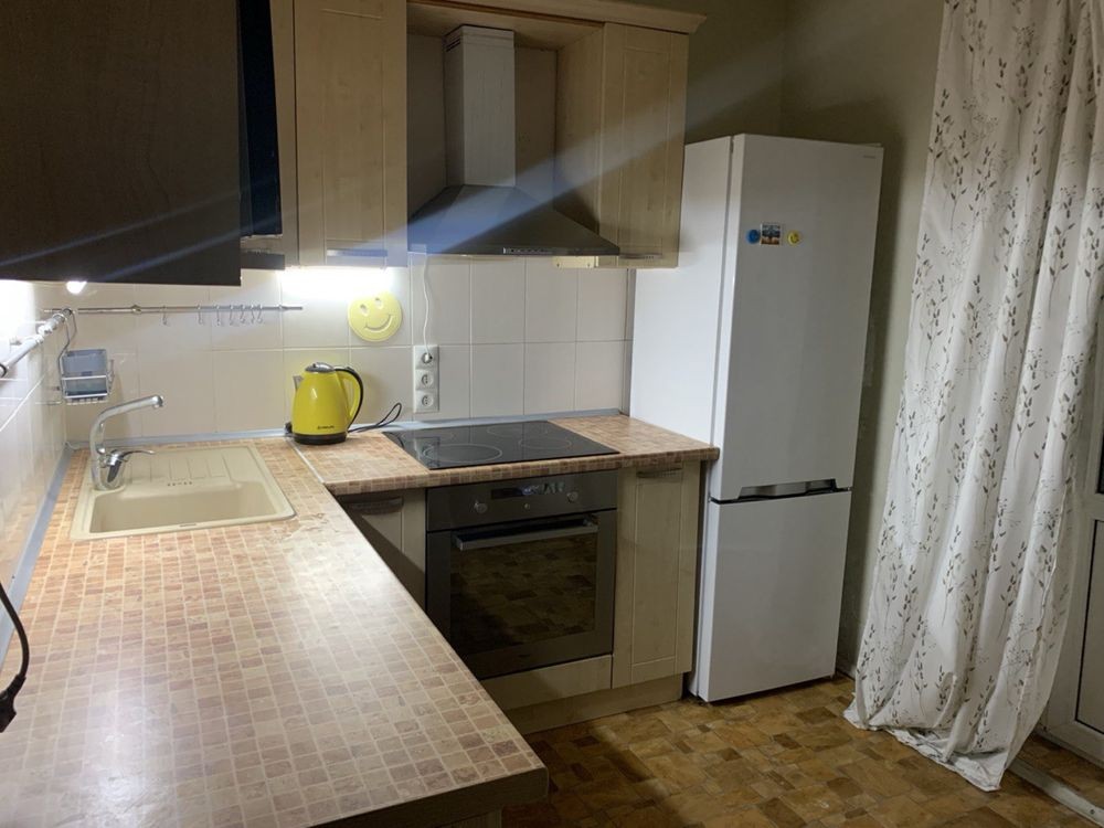 Кухня: кухонний гарнітур, стіл кухонний, три стільці, холодильник Sharp, мікрохвильова піч Samsung, індукційна варильна поверхня Electrolux, духовий шафа Whinpool, електрочайник, пральна машина Electrolux. З кухні вихід на відкритий балкон. Вітальня: розкладний диван, двоспальне ліжко 160х200 см, меблівий гарнітур, крісло, кондиціонер. Спальня: двоспальне ліжко 160х200 см, шафа, стіл письмовий, комод, крісло комп'ютерне, кондиціонер. Зі спальні вихід на засклений, утеплений балкон, який можна використовувати як робочий кабінет. Санвузол роздільний. Два ліфти, консьєрж, вхід до під'їзду – магнітний ключ або домофон. На подвір'ї дитячий майданчик, супермаркет Велмарт, парковка, стадіон.