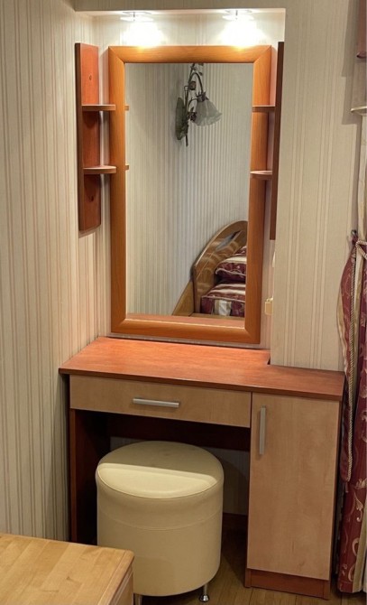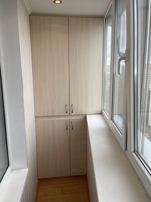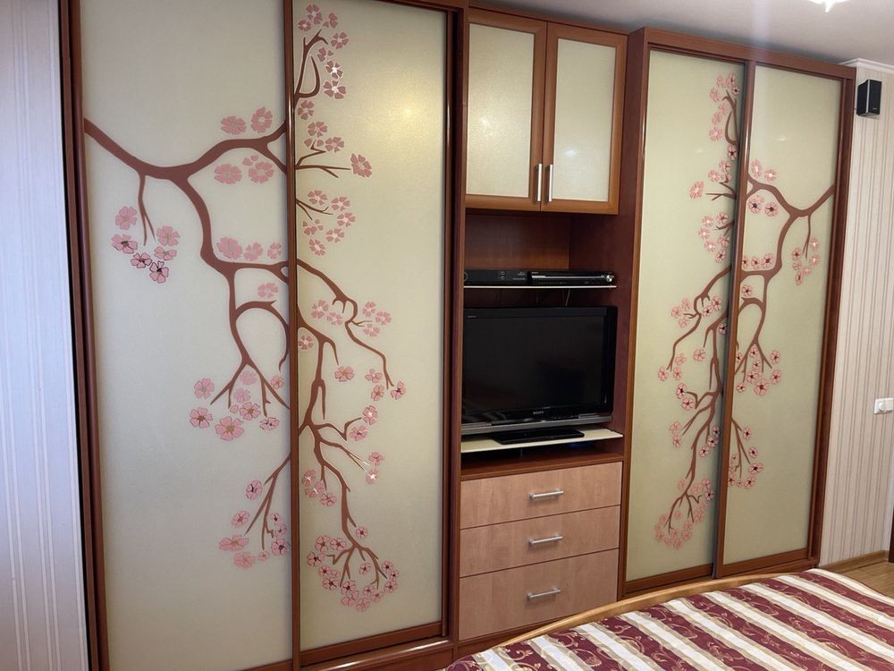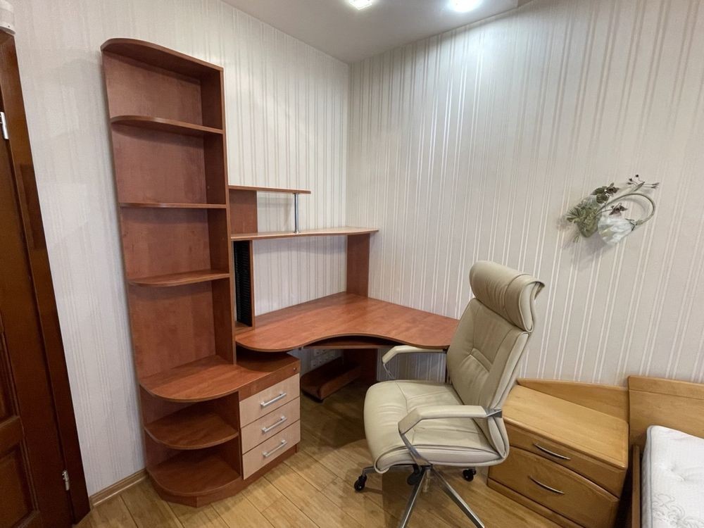 2. Спальна кімната: двухспальне ліжко ортопедичний матрас, два великих шкафів-купе, робочий/комп’ютерний стіл з полицями та шухлядами, жіночий косметичний куток, телевізор, кондиціонер, вихід на утеплений засклений балкон з вбудованими шафами.