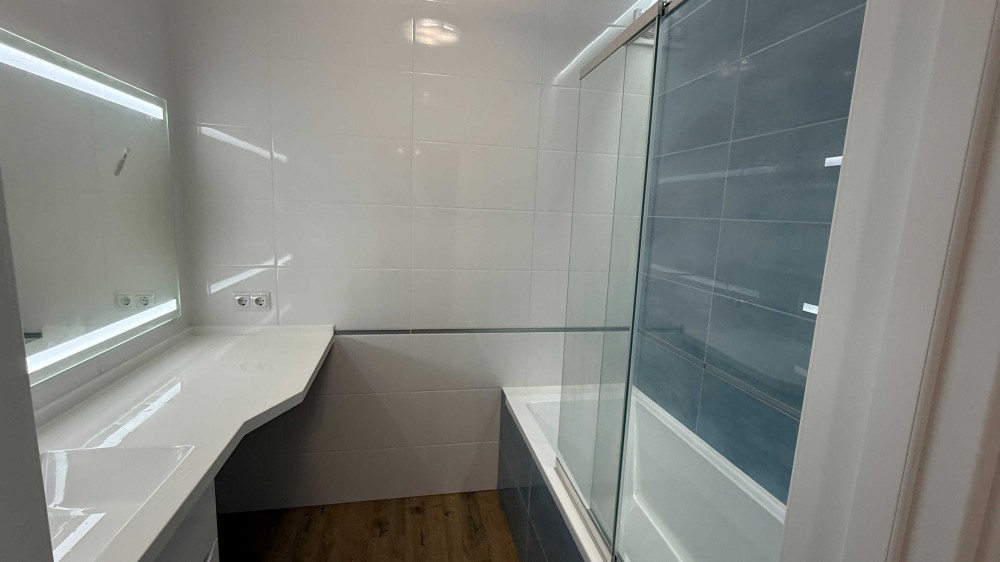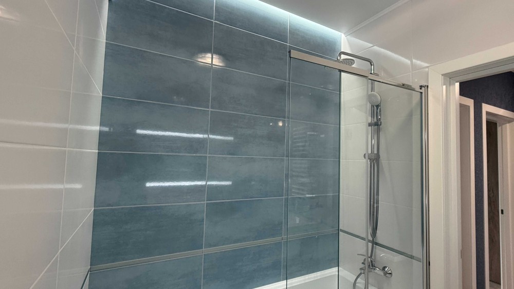 Склянна шторка у ванній, розсувна і з можливістю повного відкриття.