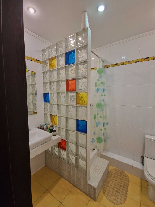 На першому поверсі - простора вітальня з обідньою зоною і вбудована кухня. Дві великі шафи. Сан вузол з душовою кабіною.