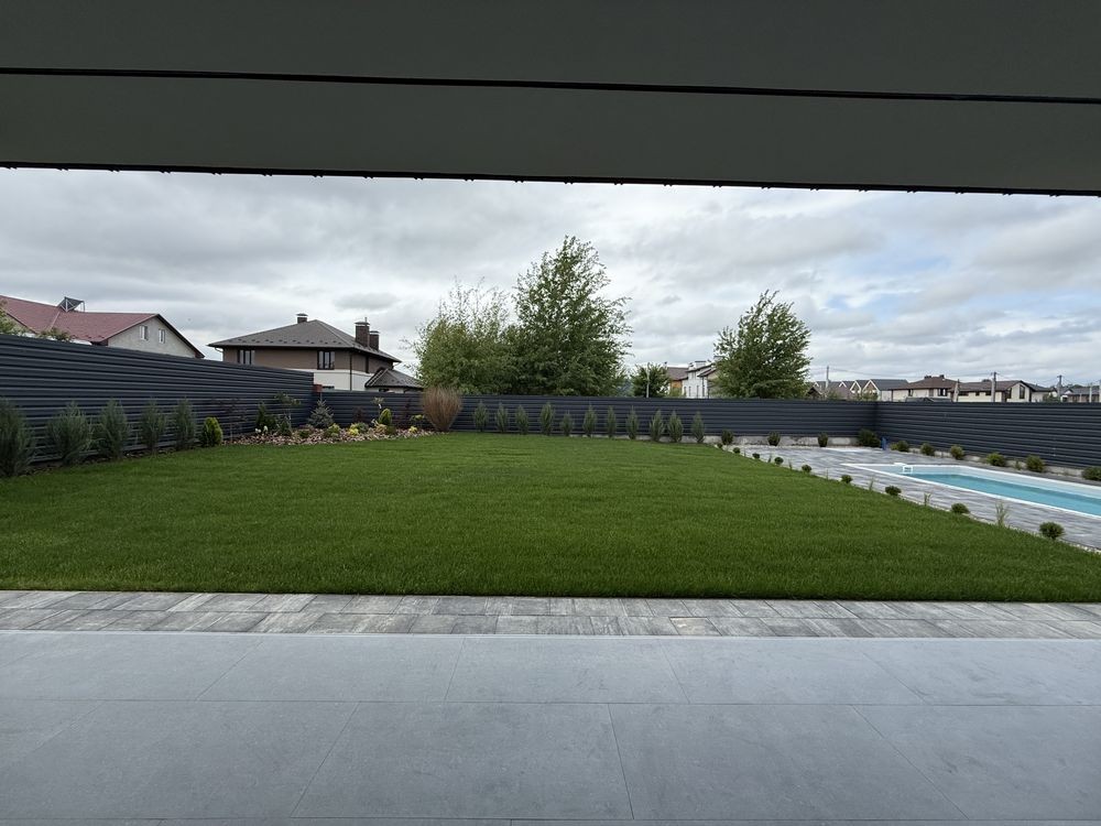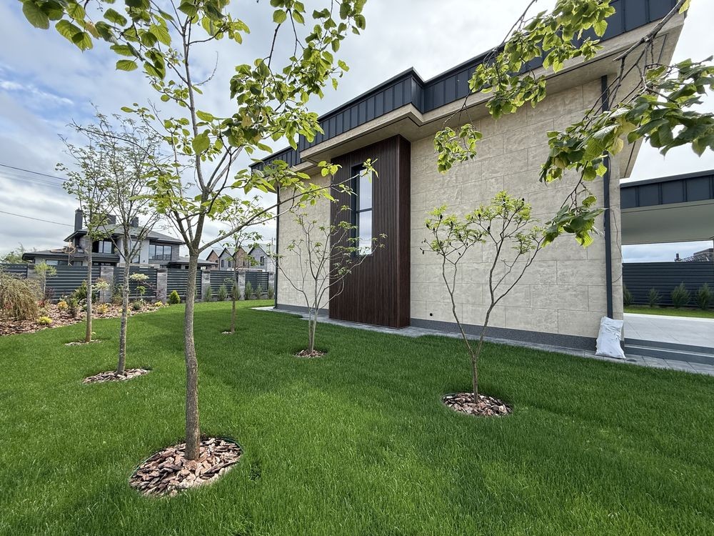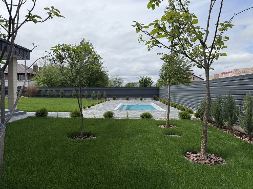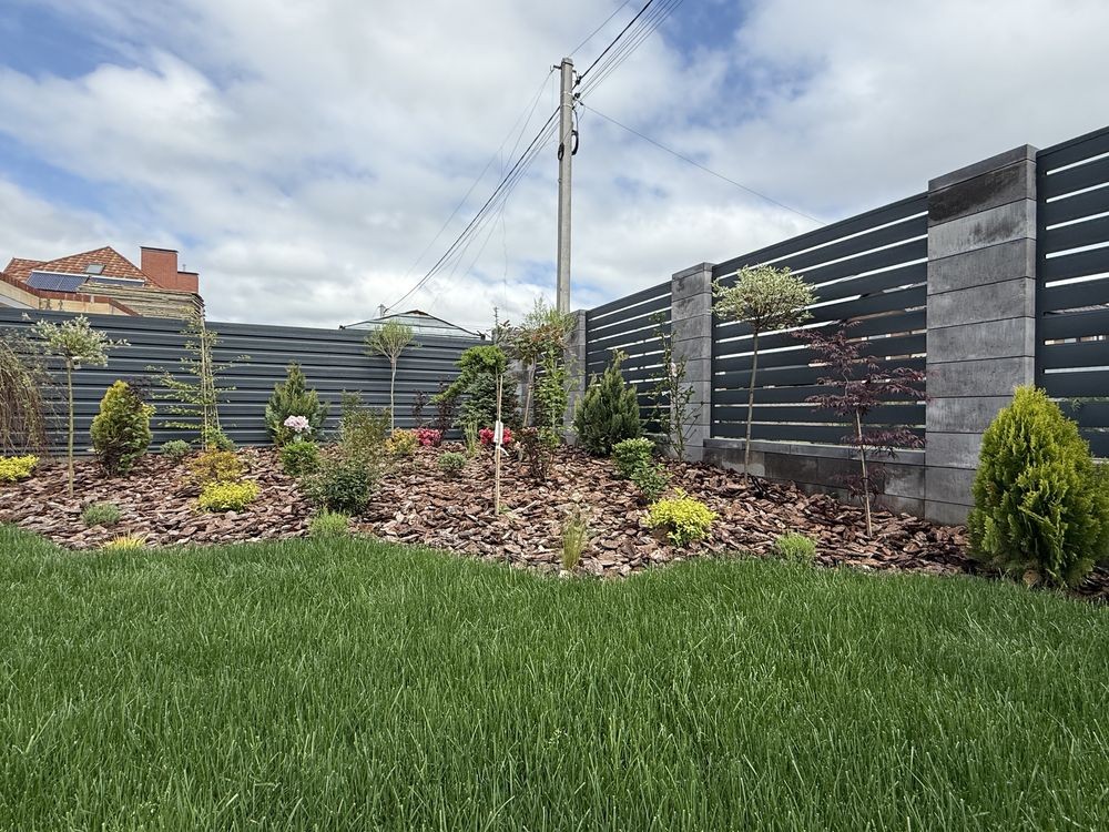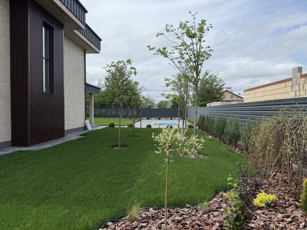 Ділянка 10 соток. Газон + автополив. Посаджені декоративні рослини, дерева та квіти. Оформлені клумби.