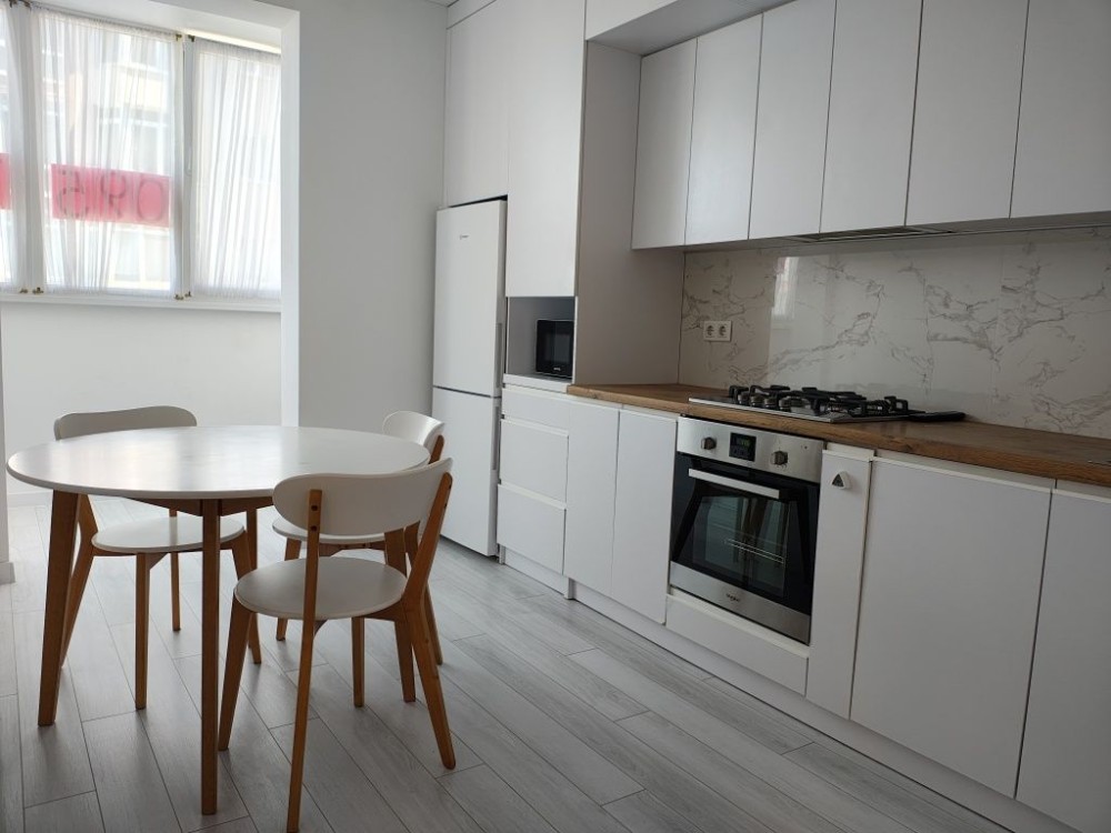 У квартирі простора кухня-студія з усією необхідною технікою та меблями. Наявні : газова варильна поверхня, духова шафа, холодильник, мікрохвильова піч, пральна машина. Кухня має обідню зону , також велику сонячну лоджію, де можна насолоджуватися краєвидами улюбленого міста.