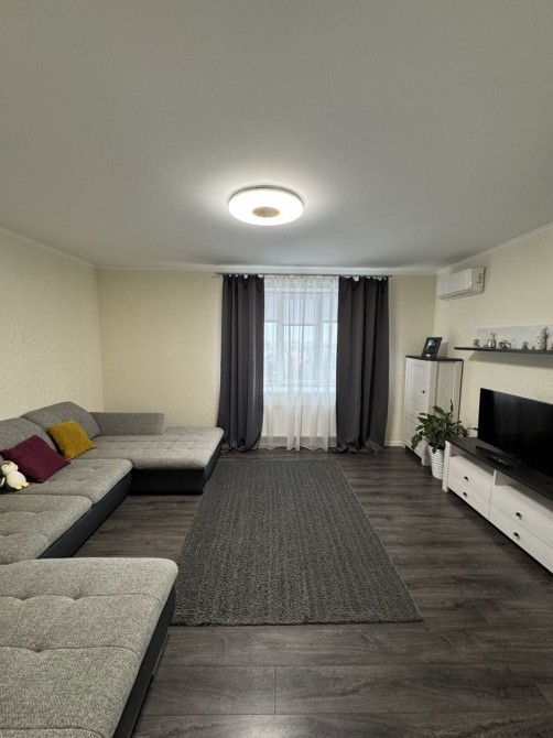 Зала – світла та простора, ідеальне місце для відпочинку, з комфортним та великим диваном.