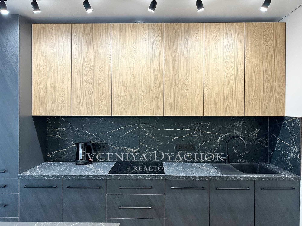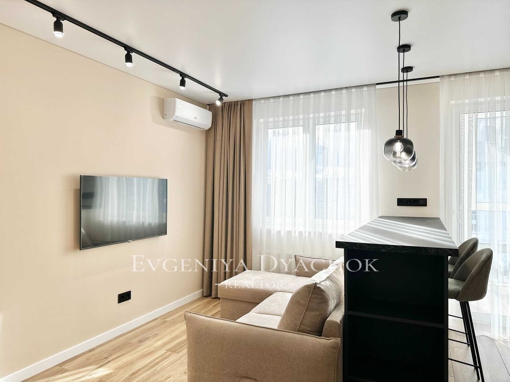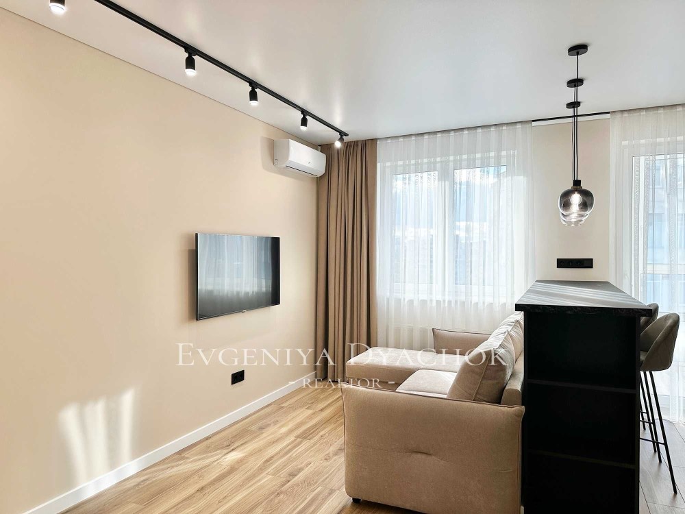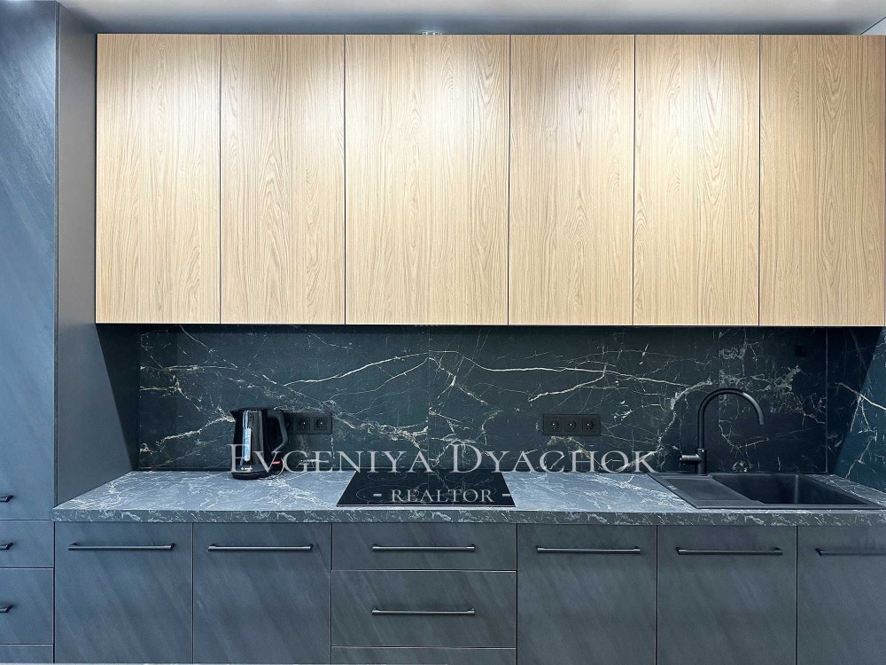 Розкладний диван, вбудовані кухонні меблі (варильна поверхня, витяжка, посудомийна машина, холодильник), телевізор, кондиціонер, бойлер, пральна машина.