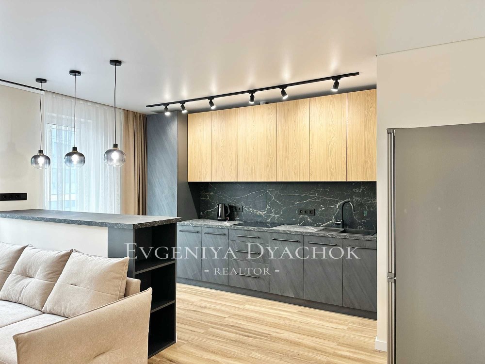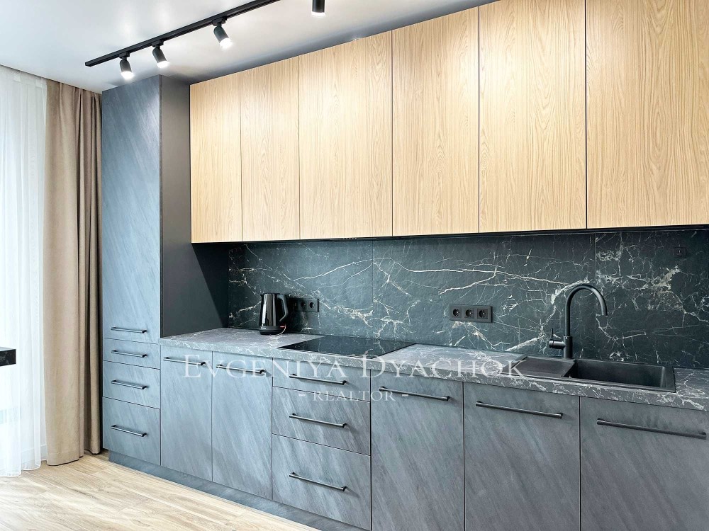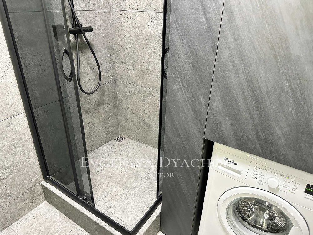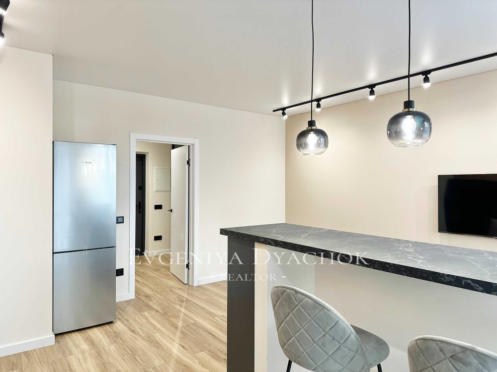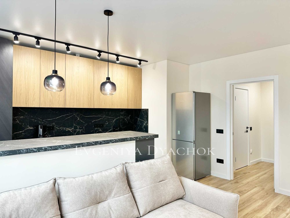 Розкладний диван, вбудовані кухонні меблі (варильна поверхня, витяжка, посудомийна машина, холодильник), телевізор, кондиціонер, бойлер, пральна машина.