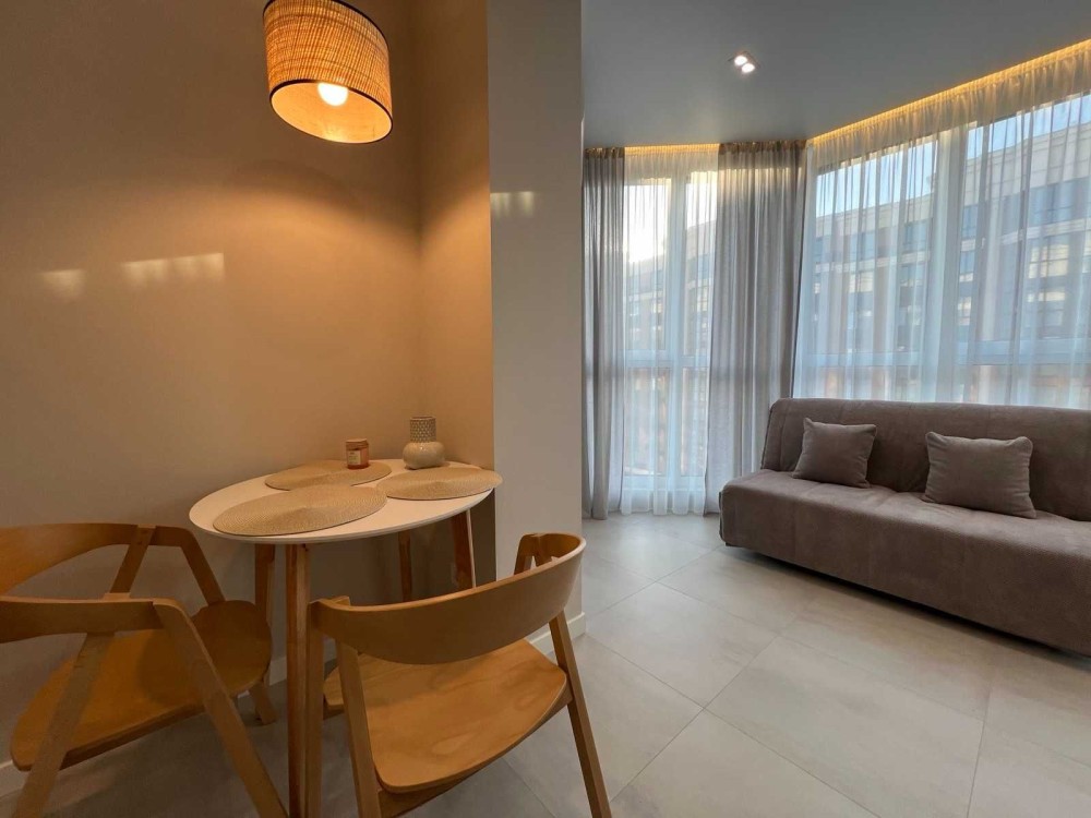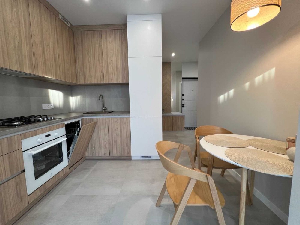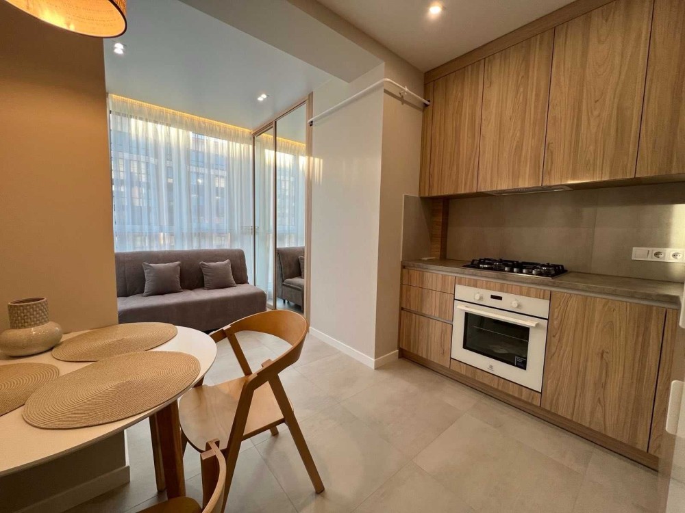 Оренда стильної 1 к кв з кухнею студією в новому будинку ЖК "Файна Таун" в Шевченківському районі, вул. Салютна, 2 Квартира 43 м2 , розташована на четвертому поверсі та складається з передпокою, спальні, великої кухні -студії та санвузла. Вікна квартири виходять в двір. Облаштована всіма необхідними меблями з екологічно чистої деревини та оснащена побутовою технікою: телевізор Samsung Smart 43, кондиціонери в кухні та кімнаті, плита індукційна, вбудований холодильник, духова шафа з функцією мікрохвильової печі, пральна машина з сушаркою. В кухні та ванній кімнаті тепла підлога, високошвидкісний інтернет. ЖК "Файна Таун" це: закрита територія з входом по картці, цілодобова охорона, відеоспостереження, паркінг, підземні контейнери для сміття, зарядні станції для електромобілів та лавки з інтегрованими батареями для підзарядки девайсів, розумне освітлення, яке підлаштовується під час доби та ще багато чого для того, щоб жити з комфортом й ні в чому себе не обмежувати) розповім при перегляді. Зручне транспортне сполучення та розвинута інфраструктура: магазини,спортивні та пішохідні зони ,зона барбекю, ресторани та кафе. Квартира, в якій поєднані комфорт та затишок, шукає своїх порядних орендарів молоду пару або одну людину без дітей та тварин. Перша оренда, квартира вільна.