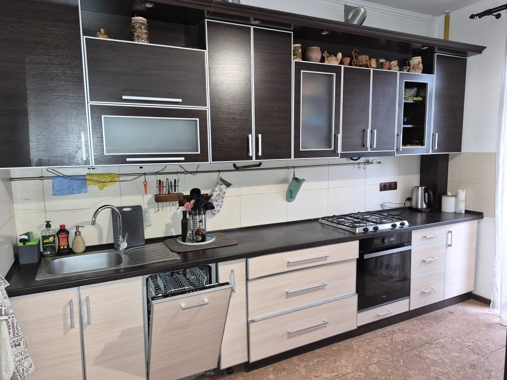 В кухні є вся побудова техніка, в тому числі посудомийка. Є газова плита. З кухні вихід на великий балкон.