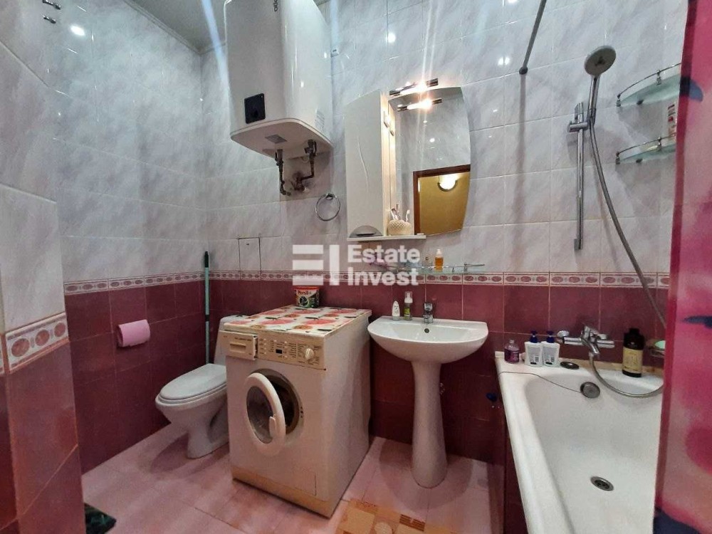 Санвузол суміжний. В ньому розташована ванна з душем, бойлер на 75 літрів, унітаз, умивальна зона, дзеркало з підсвіткою та пральна машина.