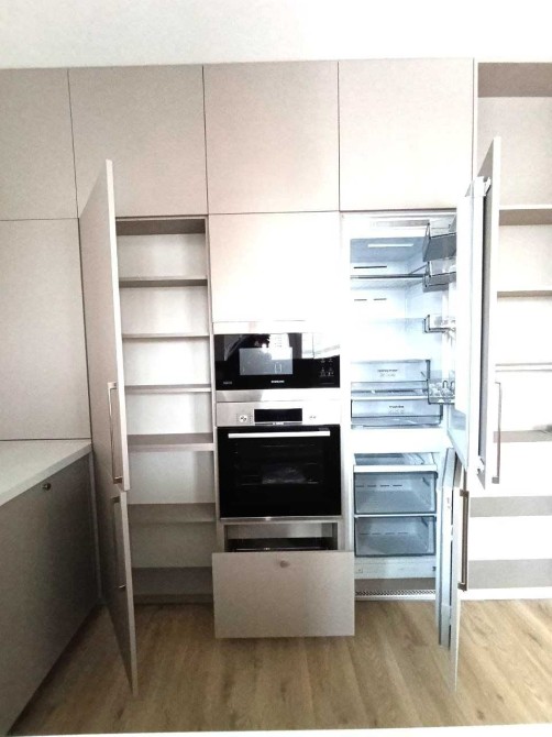 вбудована кухня із барною стійкою та різноманітною вбудованою технікою: електричною поверхнею, витяжкою, духовкою, мікрохвильовкою, холодильником, посудомийною машинкою,