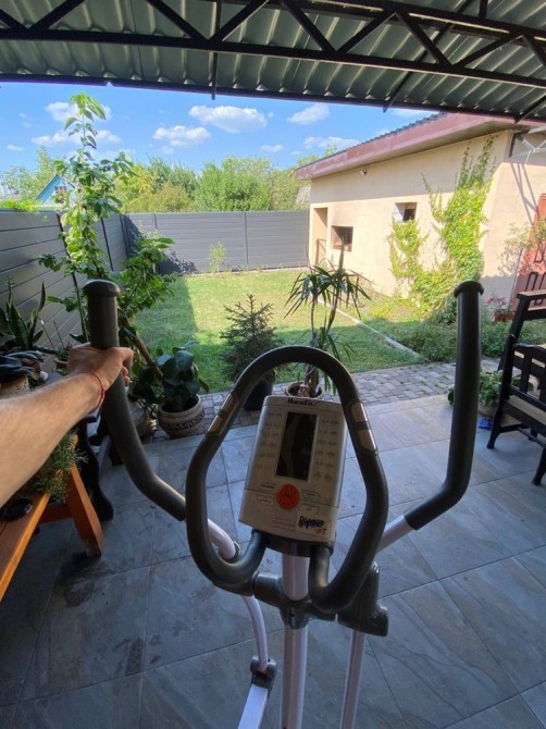 - велика крита тераса обладнана меблями, тренажерами для заняття фітнесом та прикрашена рослинами у горщиках;