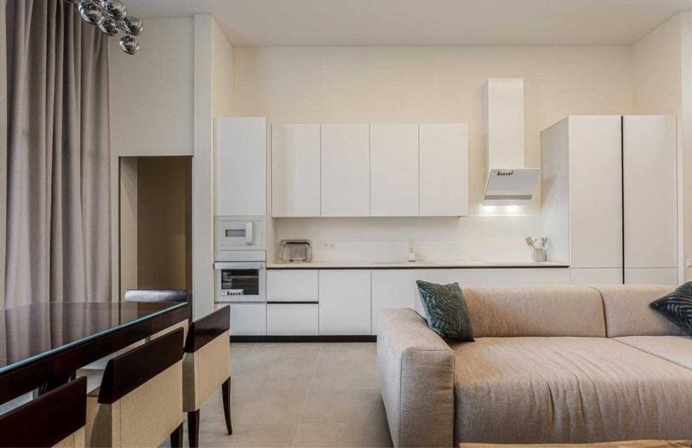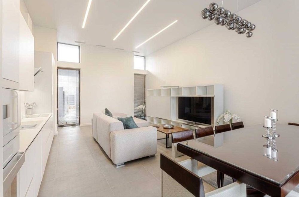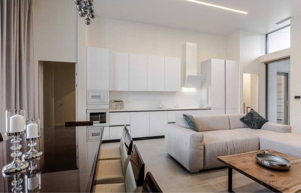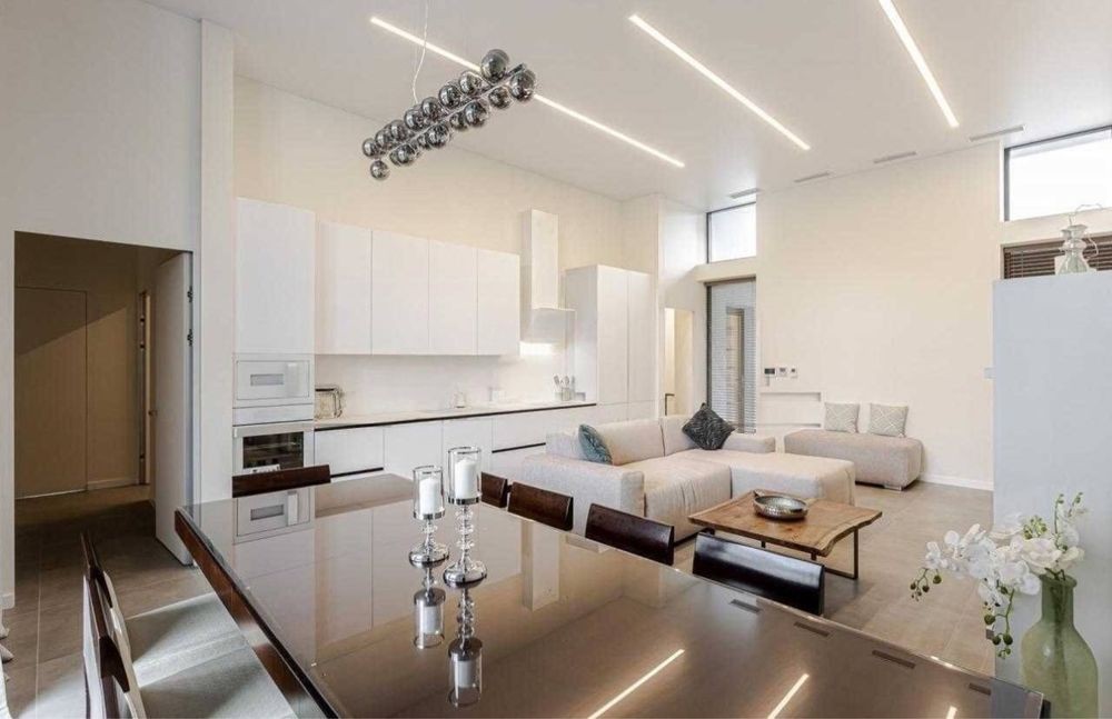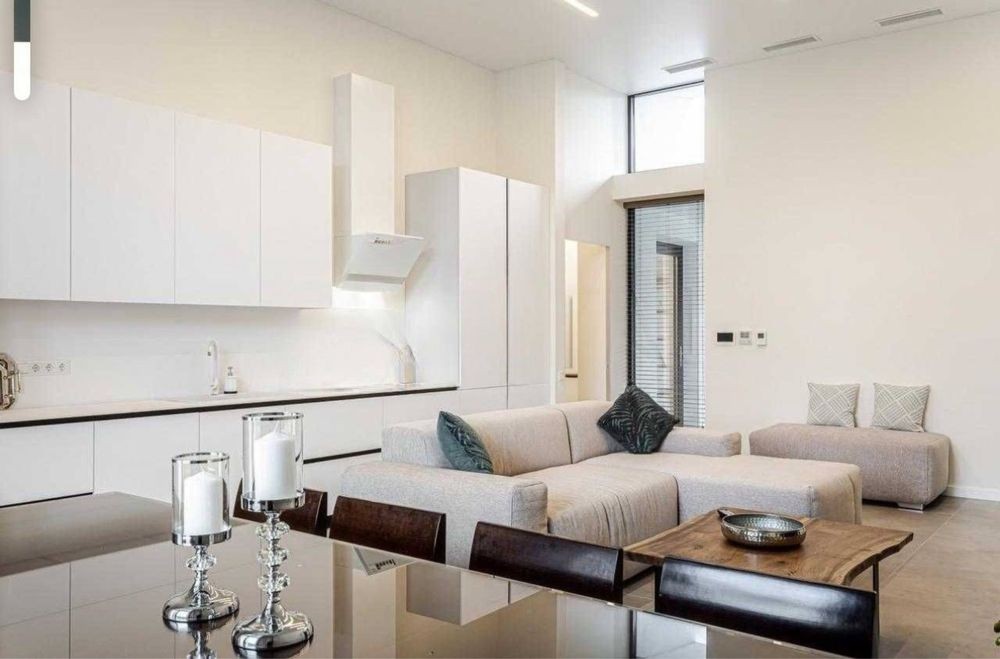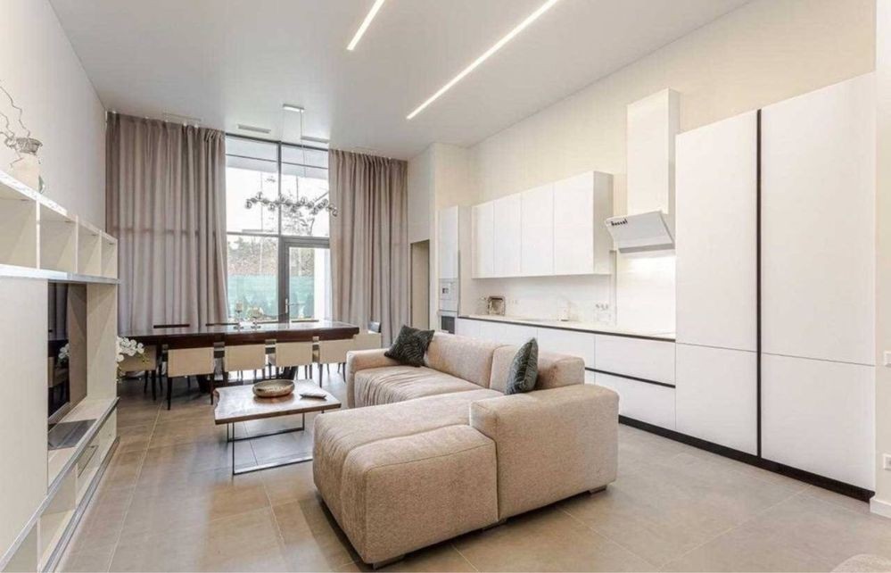 Очень большая кухня гостиная с шикарным диваном, большой обеденный стол, выход на террасу.