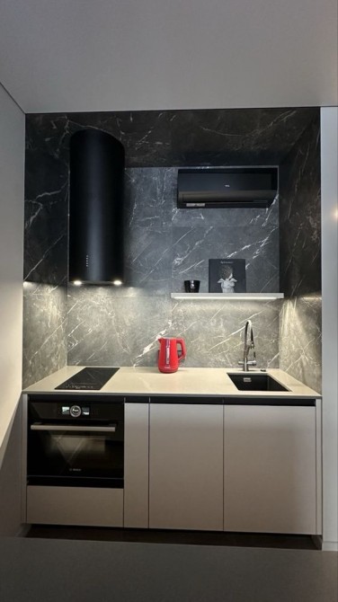 Кухня оснащена індукційною варильною поверхнею, потужною вбудованою витяжкою, духовою шафою з мікрохвилівкою ,є також посудомийна машина на 9 комплектів посуду (45 см), холодильник вбудований. Під мийкою розташований фільтр для води та датчик від протічок. Є осмос.