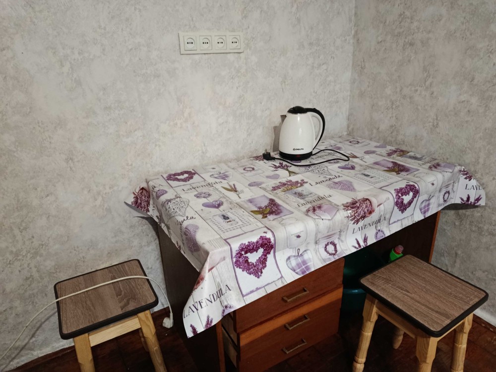 В кімнаті є меблі: диван (новий придбали сьогодні 05.11.2025) , шафа, стіл і 2 табуретки. Також є холодильник, електрочайник, пральна машина, якстоїть в коридорі біля умивальників.