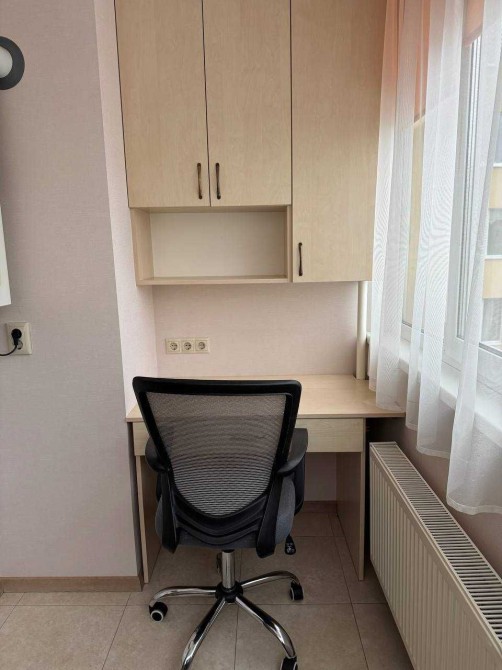На лоджії робоче місце зі зручним кріслом.