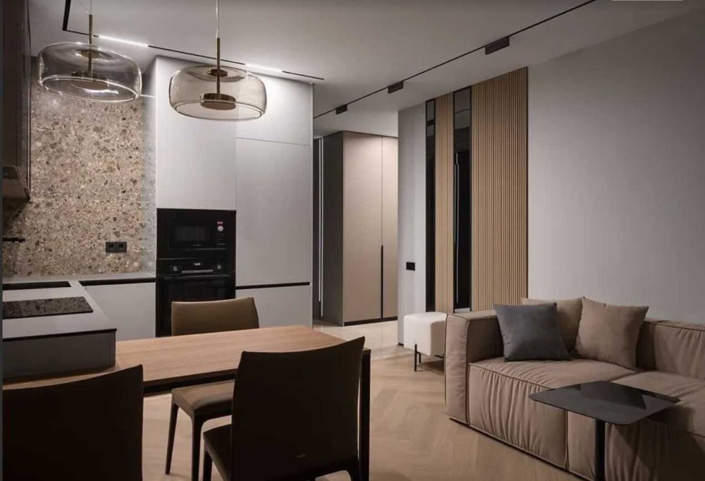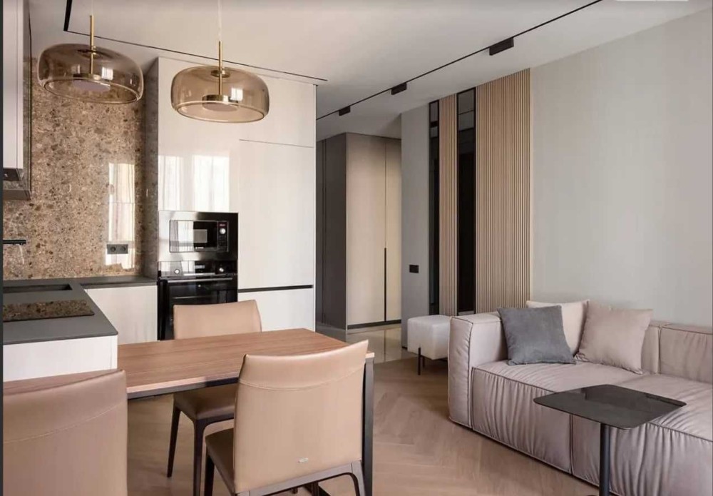 Планування: простора кухня-вітальня та окрема спальня.