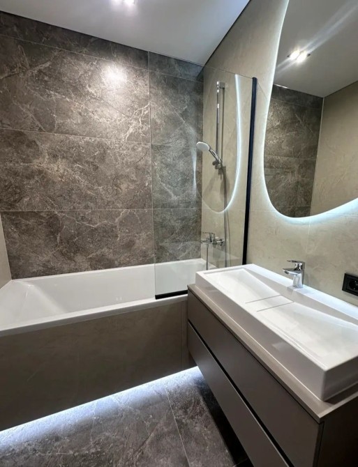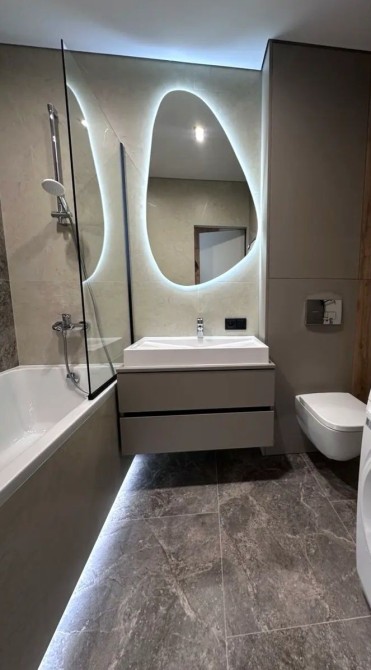 ​Ванна кімната: Сучасний санвузол з ванною, душовою лійкою та великим дзеркалом з підсвіткою.
