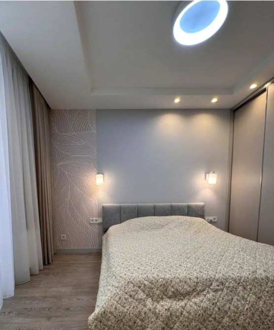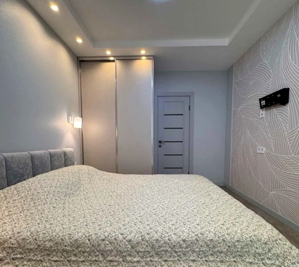 ​Спальня: Простора кімната з двоспальним ліжком, великою шафою-купе та двома тумбами. Окрасою стіни є шпалери з ніжним візерунком, що додають затишку.