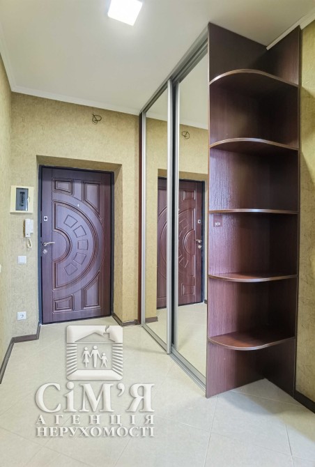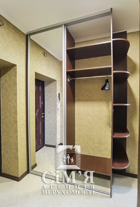 В коридорі обладнаний гардероб із розсувними дзеркальними дверима на повний зріст.