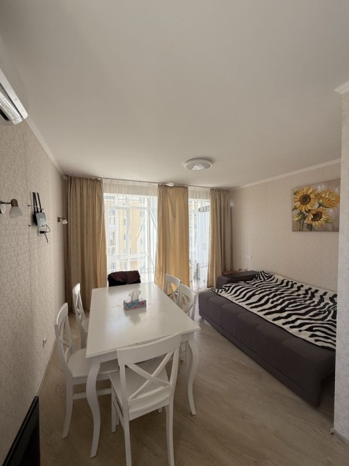 З гарним ремонтом, доглянута. Великі еркерні вікна в підлогу. В квартирі 1 кімната-спальня + кухня-вітальня, 2 сан. вузла.