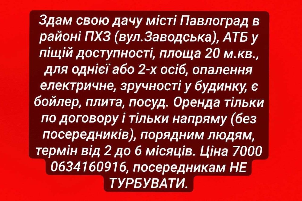 Здам свою дачу місті Павлоград в районі ПХЗ (вул.Заводська), АТБ у піщій доступності, площа дачі 20 м.кв., для однієї або 2-х осіб, опалення електричне, санвузол у будинку, є бойлер, скважина з насосом, плита, посуд. Оренда тільки по договору і тільки напряму (без посередників), порядним людям, термін від 2 до 6 місяців. Ціна 7000, дзвонити нуль шістдесят три чотириста щістнадцять нуль девять щістнадцять, посередникам НЕ ТУРБУВАТИ.