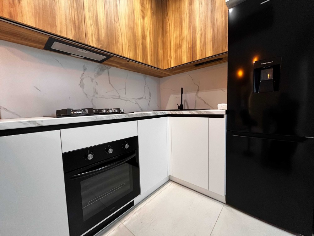Є вся необхідна техніка: холодильник, газова плита, духовий шкаф, витяжка.