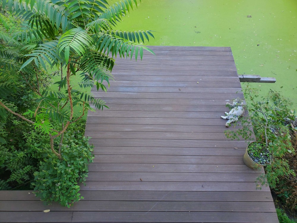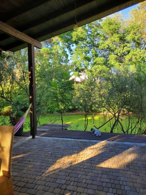 - Простора тераса в ботанічному саду на березі каналу;