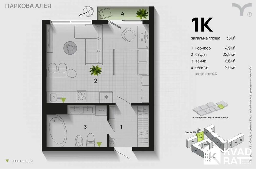 • Загальна площа 35 м2