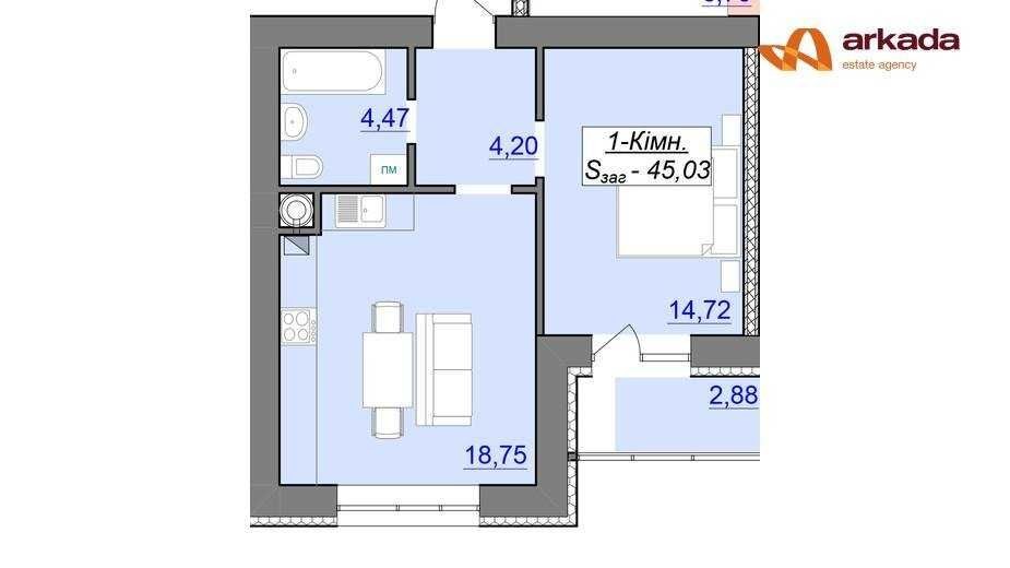 Площа 45,03 м2. Кухня-студія 20 м2.