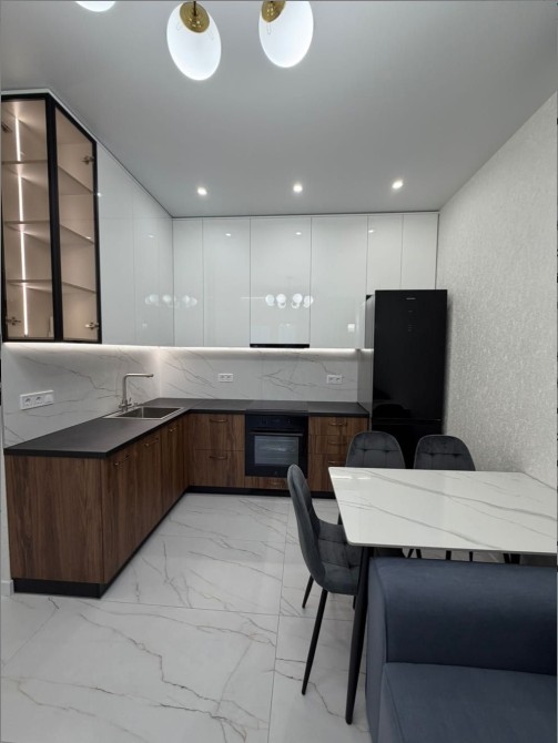 кухня-вітальня: вбудована кухня, варильна поверхня, духовка, посудомийка, великий холодильник, стіл з кам'яною стільницею, стільці, диван розкладається. З кухні студії вихід на балкон. За документами переуступка, телефонуйте оперативний показ.