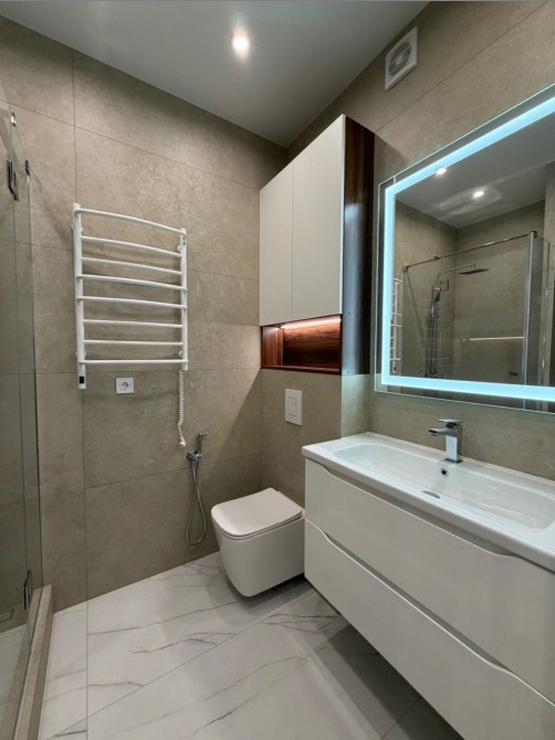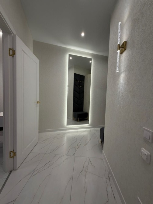Виконано якісний ремонт у світлому стилі. Вид на двір та на іподром. Панорамні вікна, балкон – не засклений. На підлозі плитка (встановлена ​​тепла підлога, по всій квартирі), ламінат, встановлена ​​мідна електрика, на стінах німецькі шпалери, кухня з матеріалу МДФ. Санвузол укомплектований: плитка метрова, дзеркало з підсвічуванням, підвісна тумба, велика раковина, гігієнічний душ, інсталяція + підвісний унітаз, бойлер, вбудована шафа для зберігання, зроблені виводи для пральної машини та сушіння, душ кабіна (під плиткою зроблена повністю гідроізоляція). Так само дана квартира повністю укомплектована меблями і технікою: передпокій (шафа купе, дзеркало в підлогу з підсвічуванням), спальня: двоспальне ліжко з матрацом, дзеркало, підвісний столик, велика шафа,