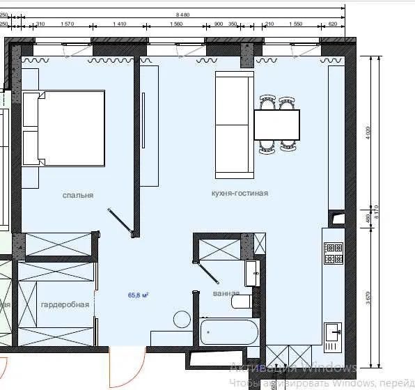 - окрема спальня, кухня- вітальня, гардероб і санвузол.