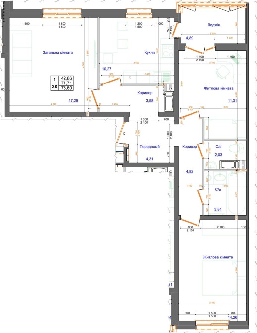 • Загальна площа 76.6 м2