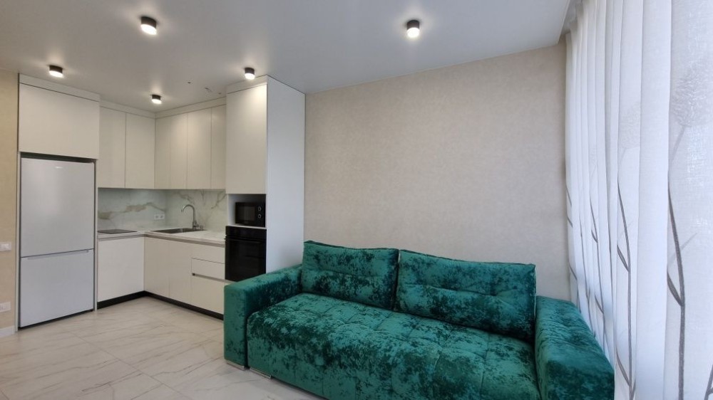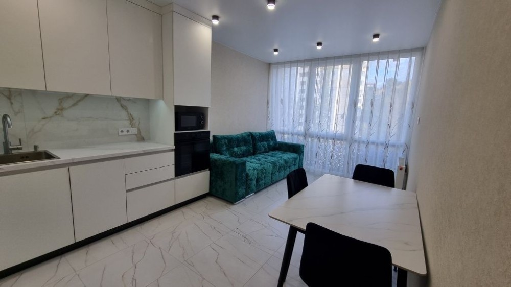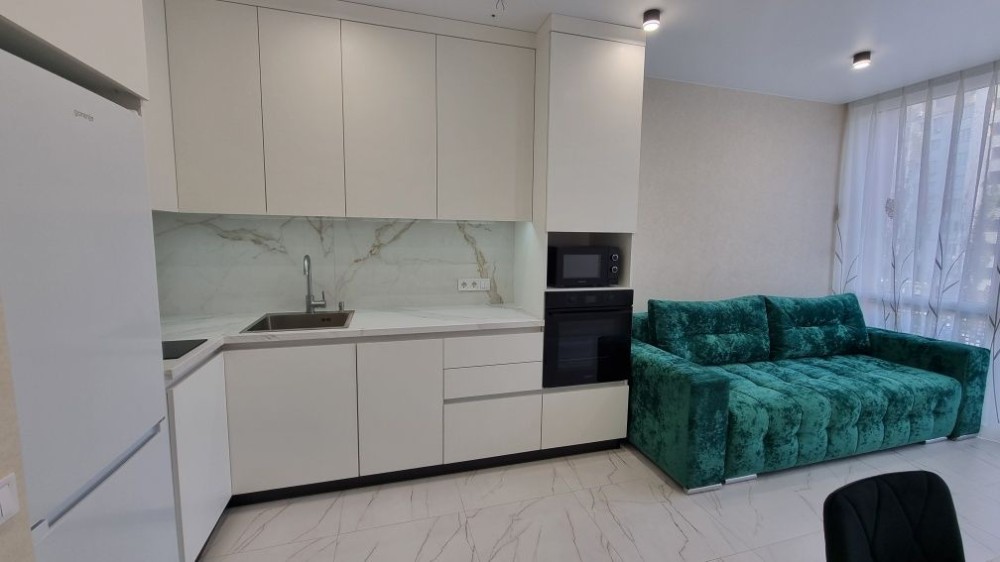 Кухня-студіо, вбудована вся побутова техніка, посудомийна машина, мікрохвильовапіч, духова шафа, варочна поверхня, витяжка. Розкладний комфортний диван, стол зі стільцями, ТВ.