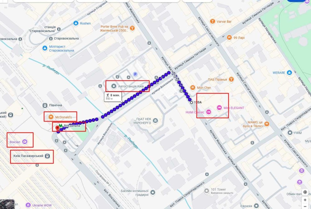 - Автовокзал «Київ» (міжнародні та внутрішні рейси) 200м.(3 хв.)