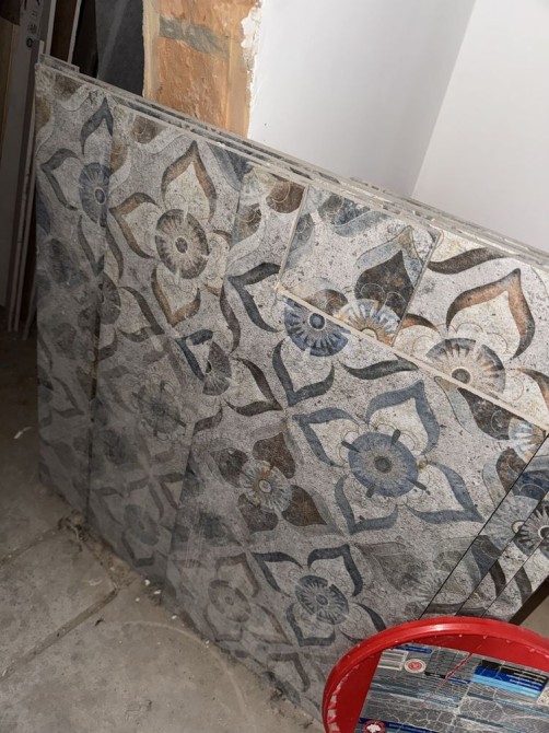 -у кімнату та гардеробний лежить плитка на підлозі вже . Закуплена плитка і для коридору і для санвузла( і підлога і стіни )