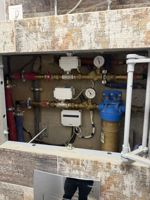 У квартирі додатково виконали монтаж запірної арматури на водопостачання, встановили систему антипотоп та механічний фільтр колбу на холодну воду.