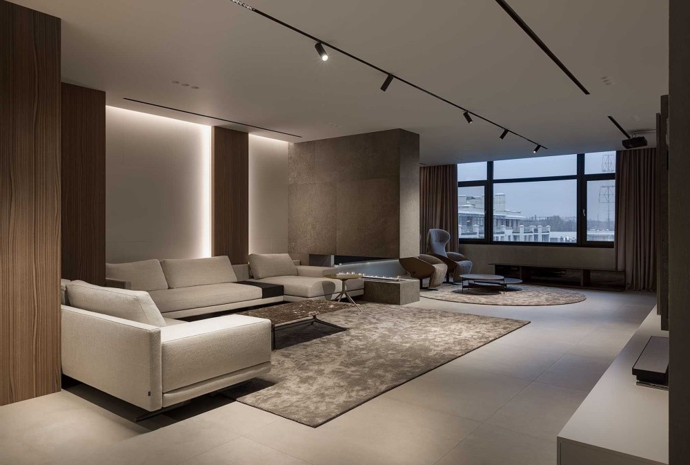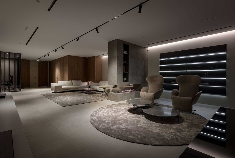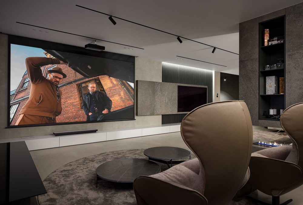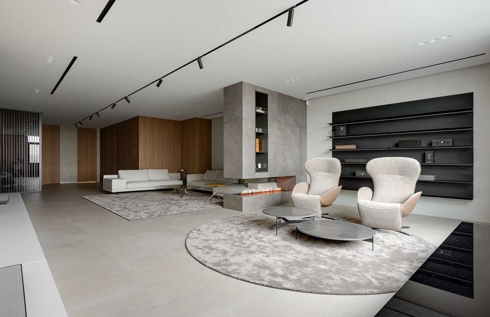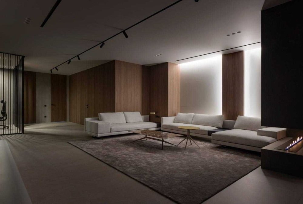 - Гостиная с камином который разделяет зону кинопросмотра и зону приёма гостей.