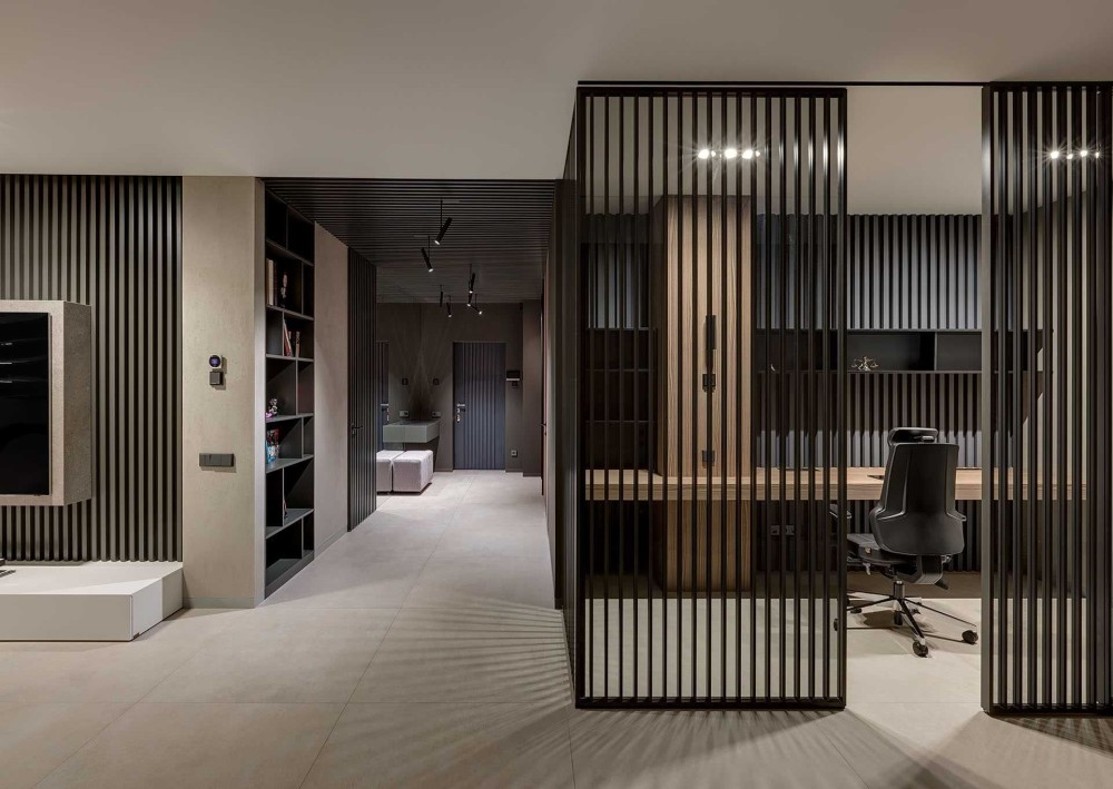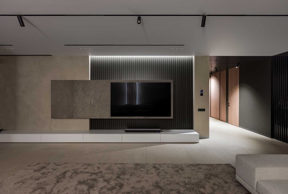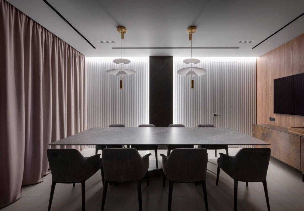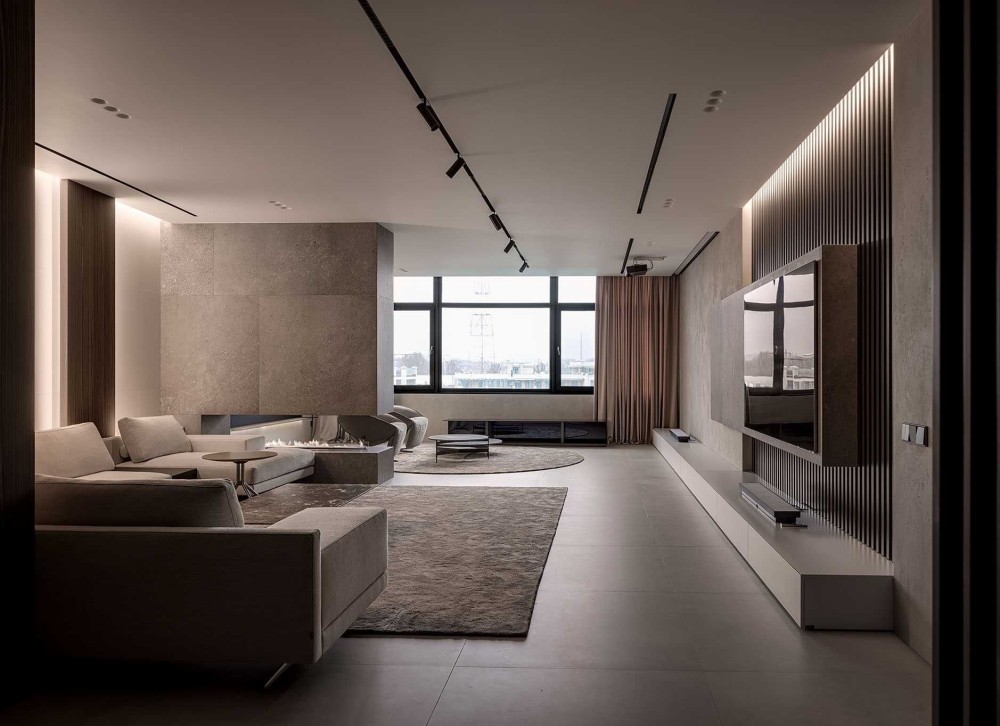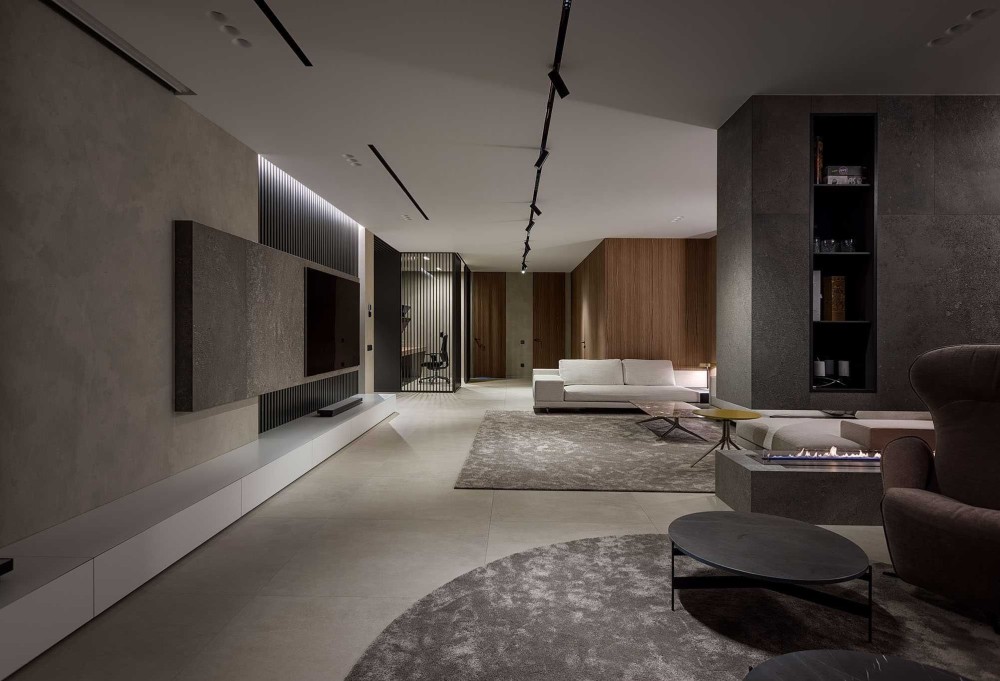 - Гостиная с камином который разделяет зону кинопросмотра и зону приёма гостей.