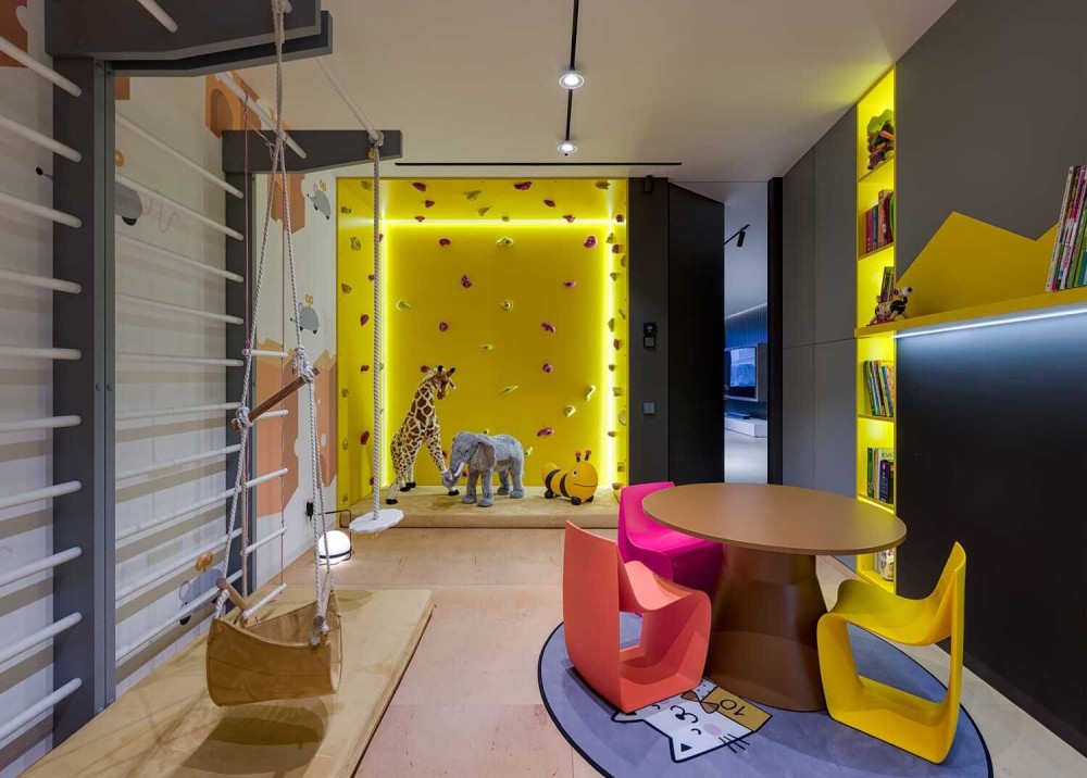 - Игровая комната в которой предусмотрели скалолазную стену, доску для рисования, шведские стенки с качелями и канатами.