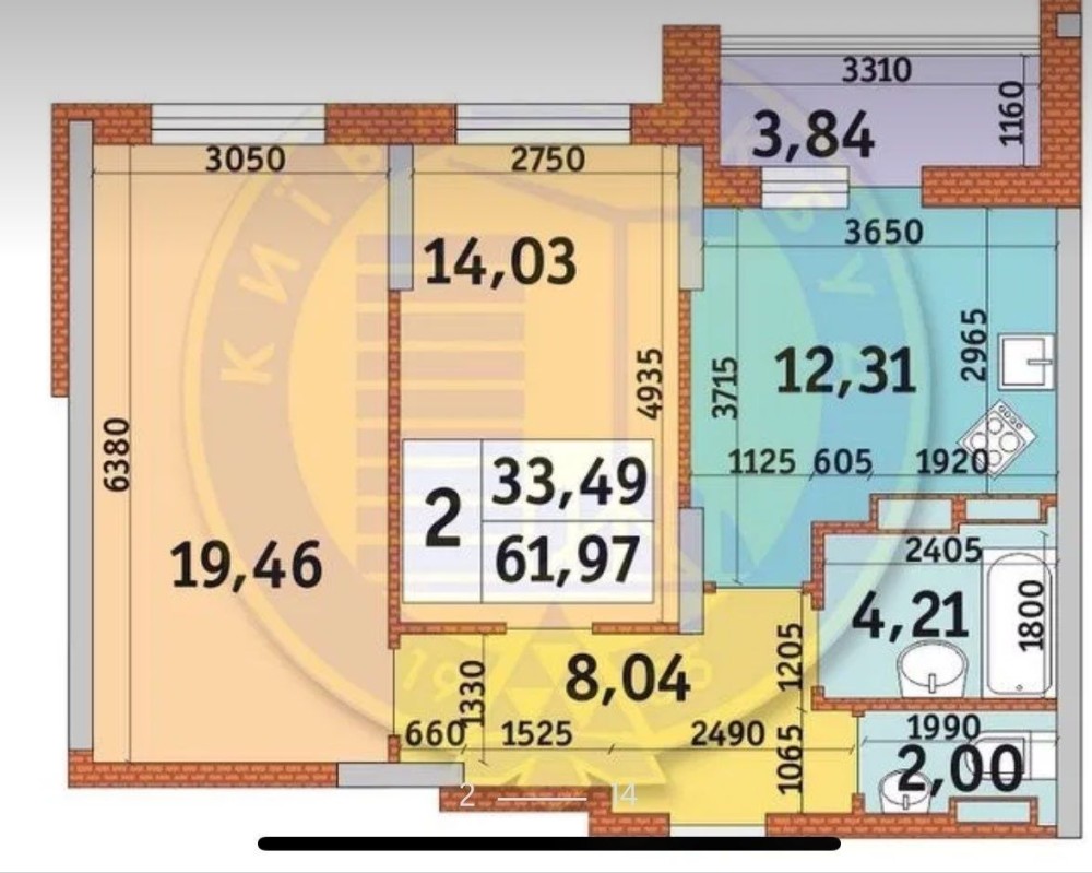 Загальна площа 62 м2, кухня 12.3м2 (з можливістю розширення до 16 за рахунок балкону), житлова площа 33,5.