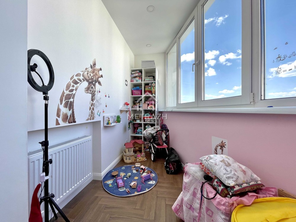 Формат квартиры: изолированая комната, большая кухня-студия с выходом на балкон, где сейчас расположен детский уголок, санузел.
