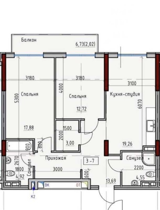 При входе большая прихожая, вход в первый санузел. Кухня – студия 20 м2, первая комната 13 м2 с гардеробной и выходом на балкон. 2-я комната со своим санузлом и выходом на балкон 7 м2. При желании можно произвести перепланировку. Подземный паркинг.
